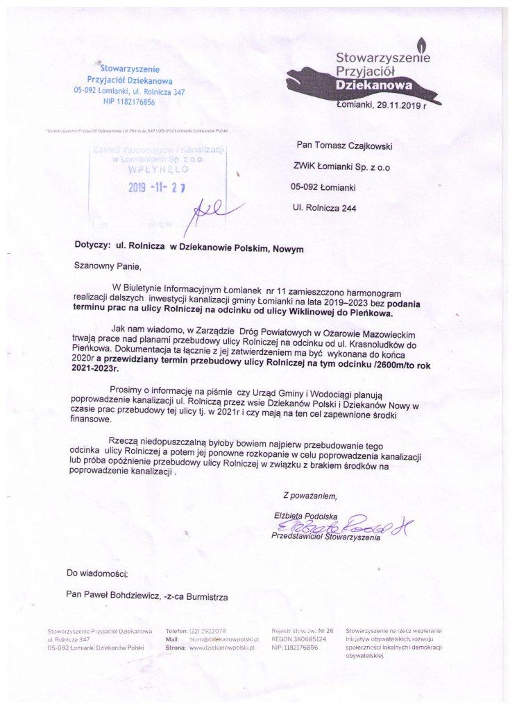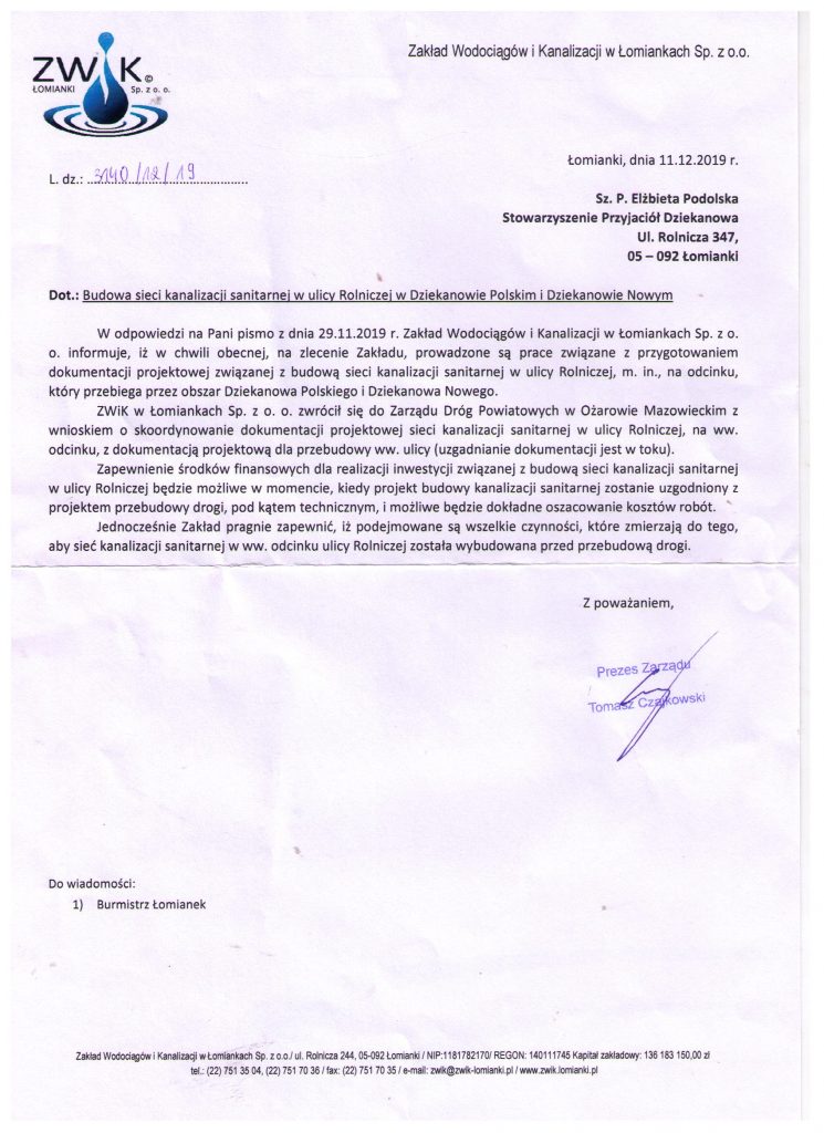 W Biuletynie Informacyjnym  Łomianek nr 11 zamieszczono harmonogram realizacji  inwestycji sieci wodociągowej i kanalizacyjnej w gminie Łomianki do końca 2023 roku. Niestety, nie znaleźliśmy tam ulicy Rolniczej w Dziekanowie Nowym i Polskim. W związku z czym, wystosowalismy zapytanie do ZWiK Łomianki czy planowana jest taka inwetycja podczas przebudowy ulicy Rolniczej.